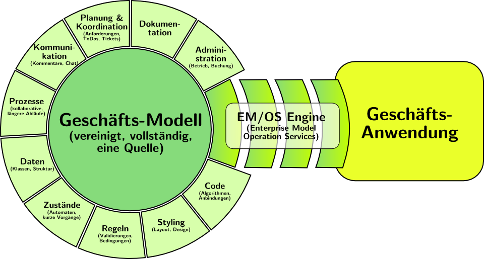 Erzeugen Sie aus Ihrem Geschäftsmodell mit der eingebauen EM/OS-Engine jederzeit vollauomatisch Ihre Anwendung, vom ersten Prototyp bis zur professionellen Lösung.